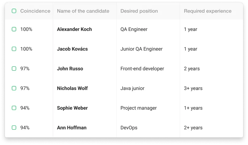 CleverStaff has many advantages and technological solutions for modern recruiting. Among these innovations is our integration with artificial intelligence, revolutionizing how recruiters organize and manage candidate information. Wondering how it works? Upon uploading CVs in any format, CleverStaff seamlessly categorizes candidate data into relevant fields within the system. This enhances smart search capabilities and generates accurate evaluation cards.