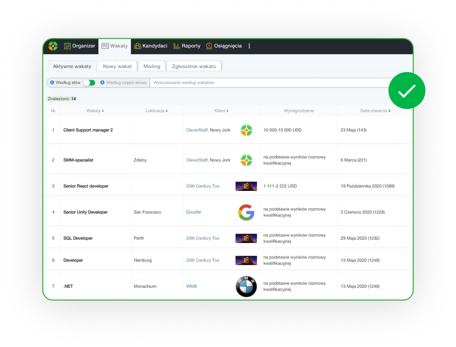 System rekrutacyjny CleverStaff został zaprojektowany specjalnie w tym celu, aby przyspieszyć proces poszukiwania i znajdowania specjalistów, których kompetencje są niezbędne dla danej firmy. Ponadto nasz system rekrutacji optymalizuje dobór personelu, oszczędzając zasoby czasowe i finansowe rekrutera oraz firmy jako całości.