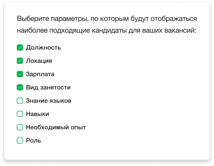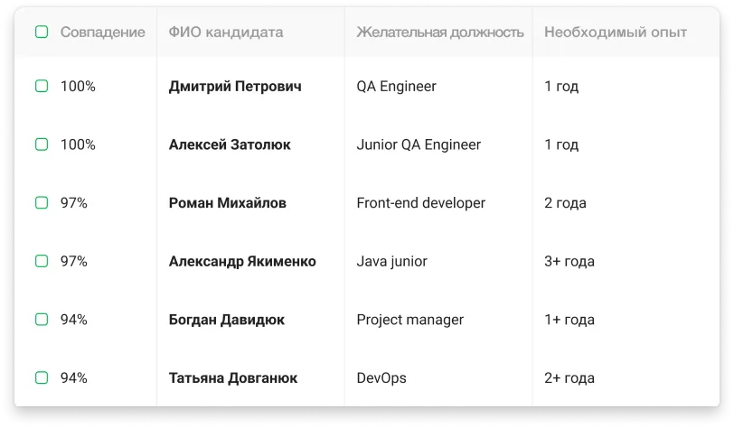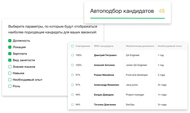 Алгоритмы системы предлагают кандидатов с вашей базы, которые максимально отвечают критериям вакансии