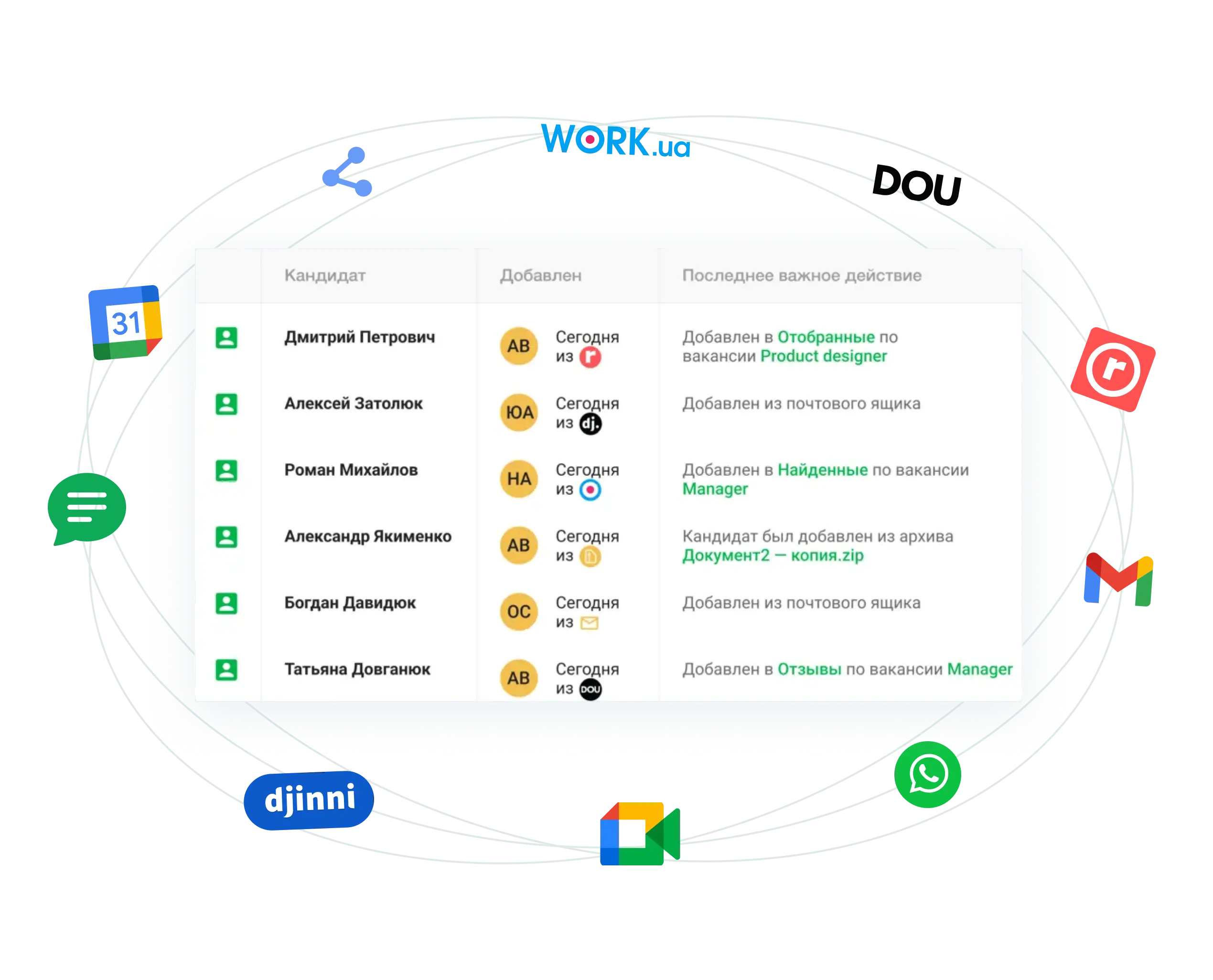 Мгновенная интеграция с Linkedln, почтой и сайтами поиска работы. Добавление кандидатов через расширение для браузера