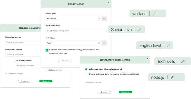 CleverStaff создан для того, чтобы каждый рекрутер имел возможность настроить систему под себя, а не наоборот. Легкая и интуитивно понятная кастомизация предусмотрена в каждом разделе и поле. Не нужно вовлекать разработчиков и тратить время, чтоб адаптировать софт под свои потребности.